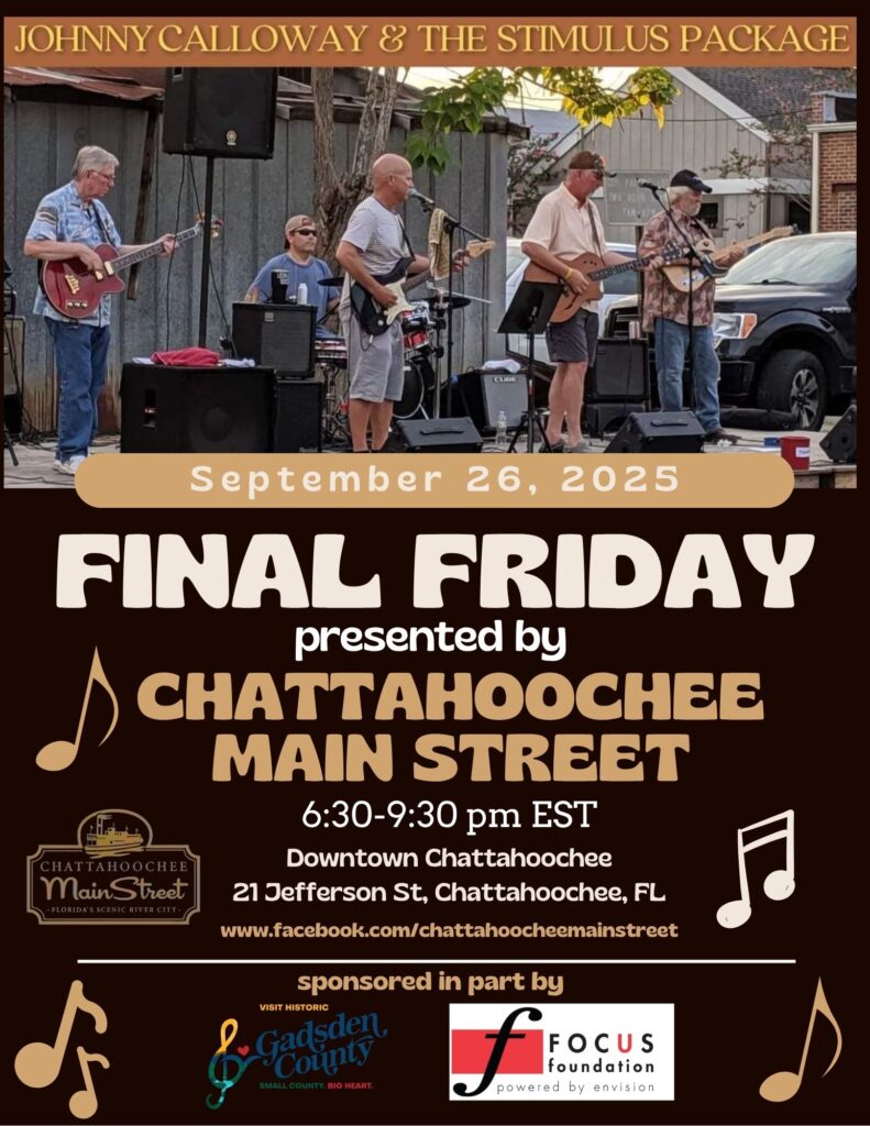 Join Chattahoochee Main Street on Friday, September 26th from 6:30–9:30 PM EST as Johnny Calloway & The Stimulus Package take the stage in Downtown Chattahoochee. Expect a night of great tunes, dancing in the street, and plenty of friendly faces.